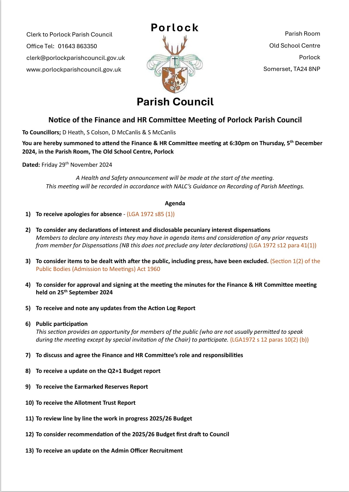 Parish Office, Old School Centre, West End Porlock, Somerset. TA24 8NP