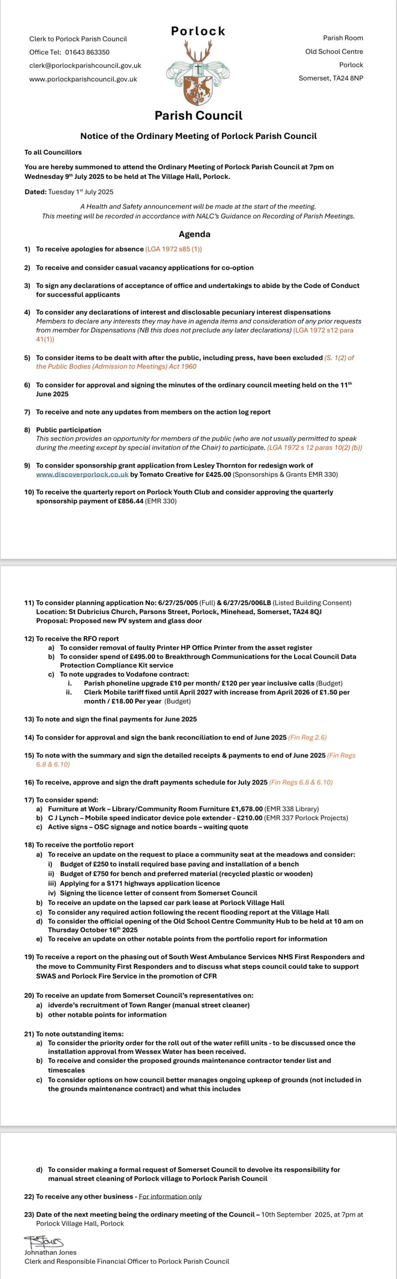 Email: clerk@porlockparishcouncil.gov.uk