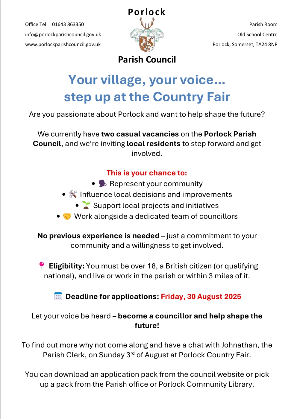 Parish Office, Old School Centre, West End Porlock, Somerset. TA24 8NP